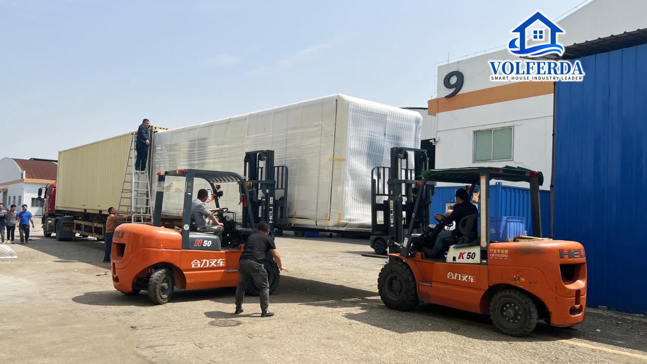 The house is fully completed at the factory before being shipped. This is usually done using 40-foot high cube containers (40HQ) or flat rack containers.